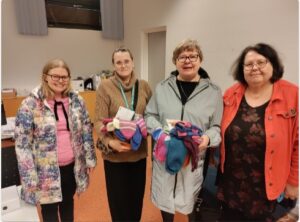 Klubimme palveluaktiviteettina kudoimme sukkia vanhuksille sekä syöpäsairaille lapsille. Kuvassa luovutustilaisuus Portsassa, jossa lahjoittajina klubimme puolesta toimivat Sanna Laiho, Eija Ylitupa ja Päivi Torkkeli.